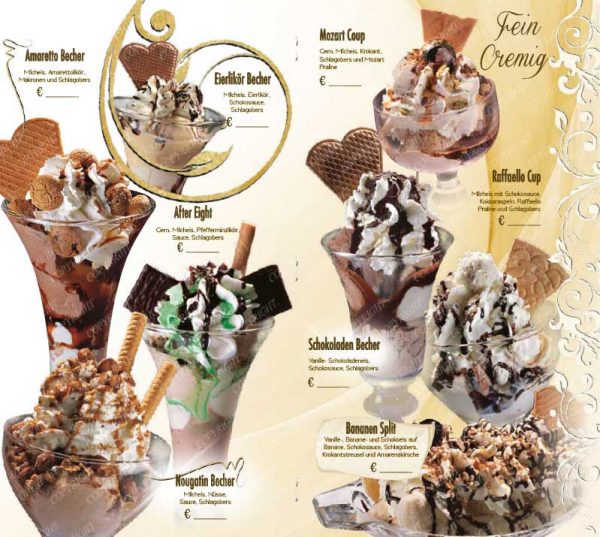 Standard Karte die teilweise Personalisiert werden kann. Sie ist eine komplette Eiskarte wobei nur die Texte geändert werden können. Die Bilder bleiben die gleichen.